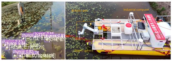 The test site for unmanned picking operation is a pond (coordinates: 117°2′16″ E, 28°4′49″ N) with a water depth of 30–50 cm. For safe draft, the hull load is limited, so only a 48 V, 20 Ah battery is equipped to reduce the load. Due to the restricted power supply, a small industrial control computer (TexHoo, Guangzhou, China) with an i5-8300h CPU (Intel Corp, Santa Clara, CA, USA) is chosen as the main control unit of the boat. This industrial control computer has the benefit of low power consumption. However, compared to systems with a dedicated graphics card, its computing capability is limited, making it unable to handle the real-time processing demands of high-precision algorithms with extensive parameters and calculations. Given the real-time requirements of the picking task, managing the computational cost of the model is crucial.