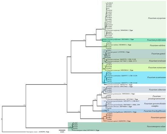- Geiser, D.M.; del Mar Jiménez-Gasco, M.; Kang, S.; Makalowska, I.; Veeraraghavan, N.; Ward, T.J.; Zhang, N.; Kuldau, G.A.; O’Donnell, K. FUSARIUM-ID v. 1.0: A DNA sequence database for identifying Fusarium. Eur. J. Plant Pathol. 2004, 11, 473–479. [Google Scholar] [CrossRef]