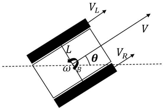 In the figure: represents the left-wheel speed of the fertilizer applicator, represents the forward speed of the right wheel, represents the vehicle wheel base, that is the distance between two tracks of the fertilizer applicator, It represents the Angle between the central axis of the vehicle and the horizontal direction, that is the azimuth Angle of the fertilization robot, is the angular speed of rotation around the Z axis, expressed in rad/s, Point B is the center of the vehicle. The kinematic model is analyzed by geometry.