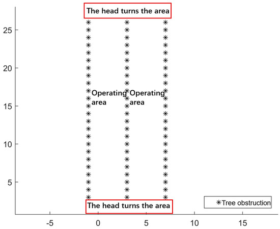 A simplified map of an orchard environment was established with MATLAB 2021a. When constructing the map, considering the safe distance traveled by the fertilizing robot, the robot is regarded as a particle, and the position of the fruit tree is properly expanded to ensure the safety of the robot during operation. The size of the map is 30 × 30 grid units, as shown in Figure 4. The positions of the fruit trees are indicated by black asterisks. There are three lines of fruit trees, and a working area is formed between the two lines of fruit trees. The end area of the fruit tree row is the head turning area, which is enclosed with a red rectangle.