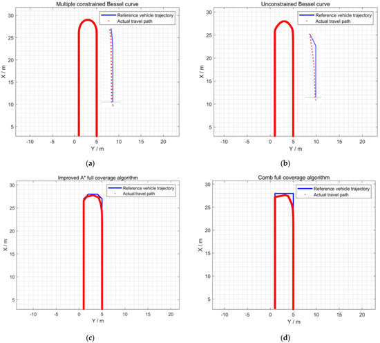 Trajectory tracking diagram of four algorithms: (a) multi-constrained Bessel optimization; (b) unconstrained Bessel optimization; (c) Improved A* full coverage algorithm; (d) Comb full coverage algorithm.