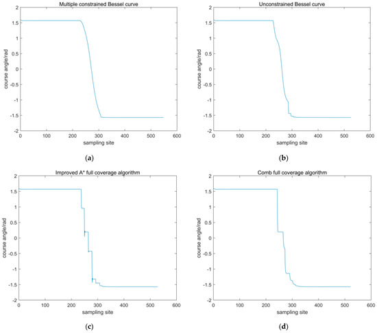 Course Angle diagram of four algorithms: (a) multi-constrained Bessel optimization; (b) unconstrained Bessel optimization; (c) Improved A* full coverage algorithm; (d) Comb full coverage algorithm.