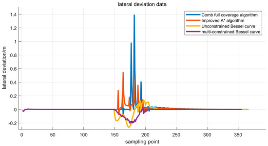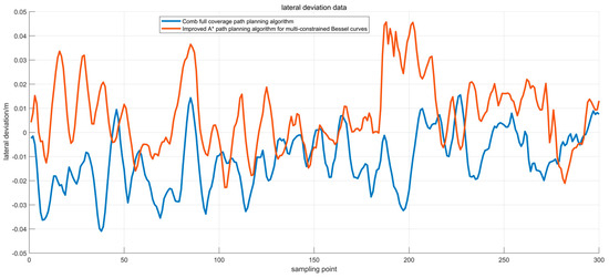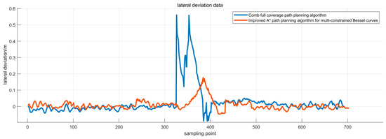 According to Figure 8a,b and Figure 9a,b, it can be seen that the path planned by the multi-constrained Bessel curve and unconstrained Bessel curve optimization algorithm with full coverage of the path planning algorithm is relatively smooth, and the robot’s heading Angle has no major sudden change as a whole. Lateral deviation is shown in Figure 10. It can be seen that when tracking, the multi-constrained Bessel curve algorithm plans the path, when entering the U-turn path, the lateral deviation fluctuates little, and the robot rides more smoothly. When exiting the curve, the lateral deviation of the optimization algorithm of unconstrained Bessel curve fluctuates greatly, which affects the robot’s ride stability.