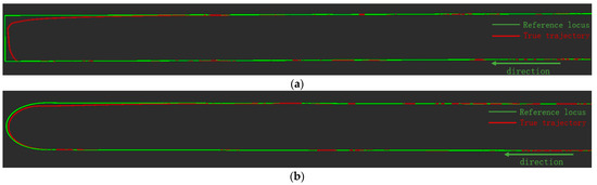 Experimental diagram of trajectory tracking for orchard fertilization robot: (a) Starting point; (b) Entry into the ground turning area.