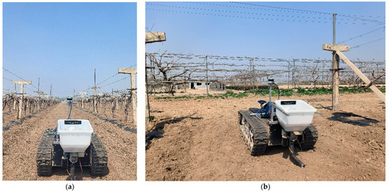 The traditional A* algorithm belongs to “point-to-point” path planning, which is generally used to plan the shortest distance between two points and is not suitable for operation in orchards; this is because when there are many lines of fruit trees, the traditional A* algorithm will directly plan the shortest distance between the starting point and the target point and cannot cover every line of operation area. Therefore, on the premise of ensuring the effectiveness of single-row operation, this study added guide points in the front and back midpoints of each fertilization area, realized the whole plot coverage through the iterative A* algorithm, made the robot walk to the middle of the plot, and the robot planned from the starting point to the first guide point and then planned from the first guide point to the second guide point until we find the target point. The advantage of this algorithm is that it can not only achieve full coverage of orchards but also make use of the property of A* algorithm to plan the path to avoid the static obstacles in the grid map in advance so as to improve the operation efficiency. The cultivation pattern in the Qianmuyuan Garden Grape Base follows a ridge-planting approach, where grapevines are planted in a single row on each ridge, with row spacing set at 3 m.