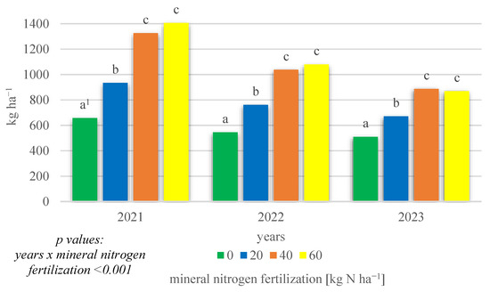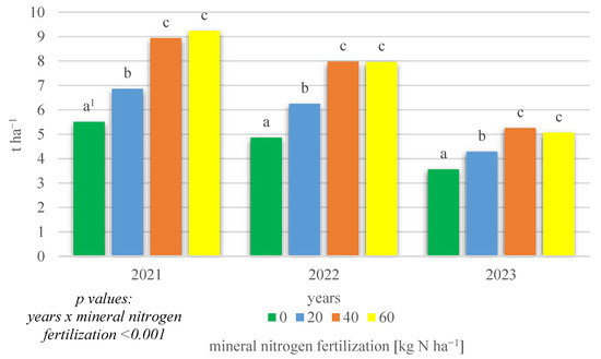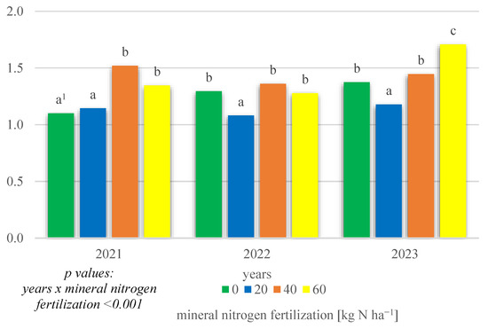The field research also demonstrated a significant interaction of growing season conditions × mineral nitrogen fertilization (p < 0.001) (Figure 2).