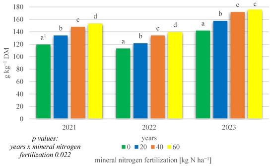 This shows that, in all years of the research conducted, the highest DM yields were obtained with fertilizations of 40 and 60 kg N ha−1, while the lowest yields were obtained with no mineral nitrogen fertilization.