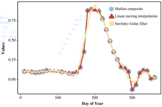 - Chen, J.; Jönsson, P.; Tamura, M.; Gu, Z.; Matsushita, B.; Eklundh, L. A simple method for reconstructing a high-quality NDVI time-series data set based on the Savitzky–Golay filter. Remote Sens. Environ. 2004, 91, 332–344. [Google Scholar] [CrossRef]