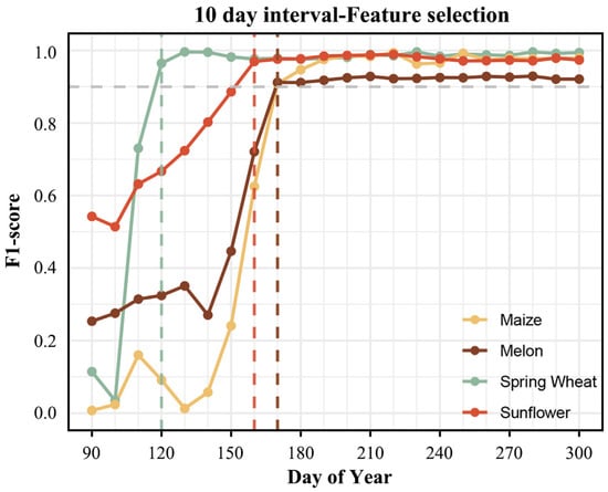 - Median synthesis was used to investigate the effect of different time intervals on early crop identification. In this paper, we synthesize the S2 feature time series with fixed time intervals of 10, 15, 20, and 30 days, covering a range from the DOY of 90 to the DOY of 300. The median synthesis method is easy to apply, and many previous studies have demonstrated its superiority over the mean synthesis method [1,41,44].