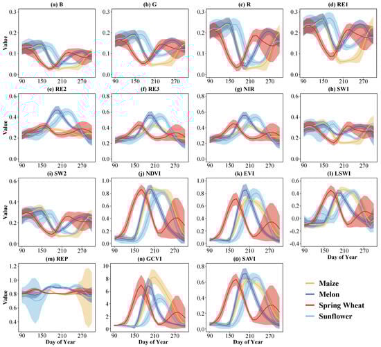 - Spectral indices. This study selected six spectral indices as candidate features for crop identification to improve the sensitivity of HID crop identification. NDVI is a widely used metric for identifying the distribution of crop types [46]; EVI has a solid ability to overcome the growing season saturation phenomenon [46]; LSWI is a good indicator of vegetation water content [47]; REP is a red-edge based index that is sensitive to crop conditions [48]; GCVI index has been shown to have a solid ability to separate crops [49]; SAVI is used to minimize soil background effects [46]. The specific equations used to calculate these spectral indices are shown in Table 2.