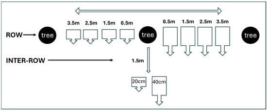 Sampling: Soil samples (250 g) were collected as shown in Figure 1. In the orchard, walnut trees were arranged in rows, at 4–5 m from each other, with approximately 7–8 m between one row and the other. Soil samples were collected at 0.5 m, 1.5 m, 2.5 m, and 3.5 m from the tree along the row at two different depths, 20 cm and 40 cm (Figure 1). Soil samples were also collected between one row and the other (inter-row) at 1.5 m from the tree and at the two depths of 20 cm and 40 cm.