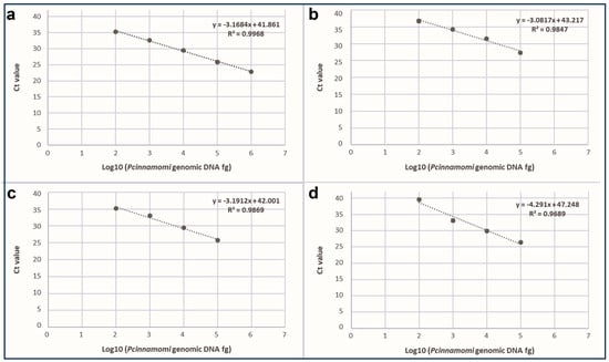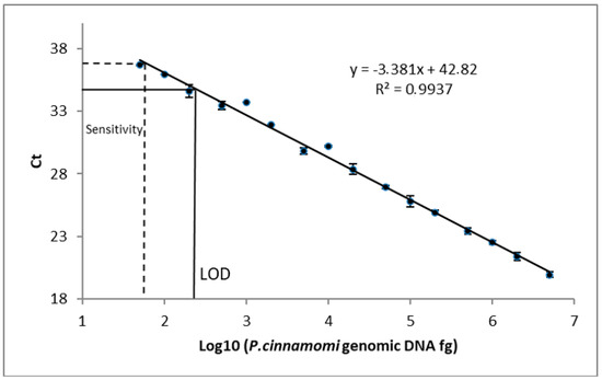The limit of detection (LOD, expressed in ng) was determined as the lowest amount of target genomic DNA that was amplified in 100% of the replicates. The linearity of the method was evaluated on three different P. cinnamomi isolates: CREADC-Om274 from walnuts, CREADC-Om139 from chestnuts, and CREADC-Om144 from oaks.