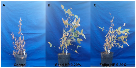 Soybean plants treated with HP at the maturation stage. (A) Control plant, (B) plant with seed application of HP, and (C) plant with foliar application of HP.