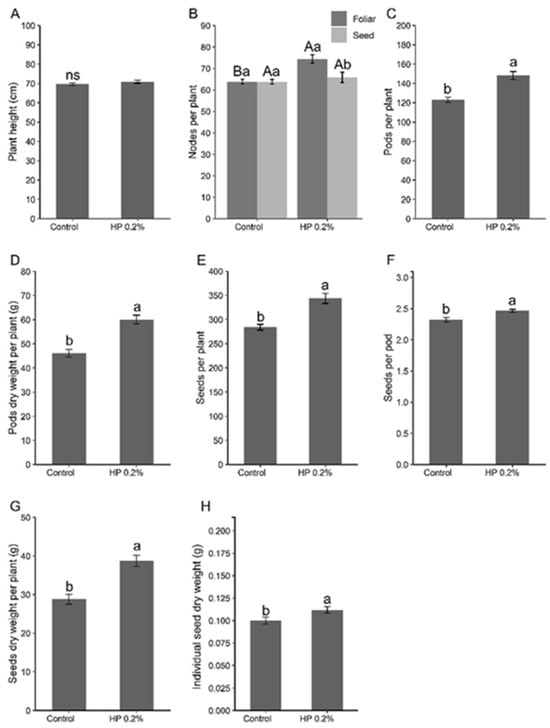 Effect of the application of HP on (A) height, (B) number of productive nodes per plant, (C) number of pods per plant, (D) pod weight per plant, (E) seeds per plant, (F) seeds per pod, (G) seed weight per plant, and (H) dry weight per seed. Different uppercase letters indicate the statistical difference between application methods, while different lowercase letters indicate the statistical difference between treatments (Tukey test, p < 0.05). Bars represent standard deviation.