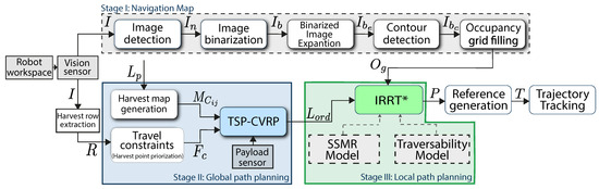 General scheme of the integrated global (TSP-CVRP) and local planning (Informed Rapidly-exploring Random Tree star () strategy for SSMRs under terrain constraints.