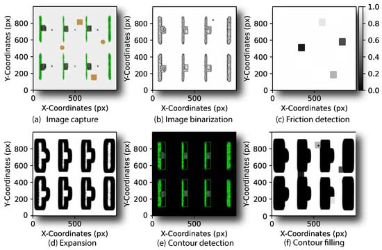 The structural map is augmented with information arising from previous navigation scenarios on geolocalized areas exposed to potential slip phenomena. This information comprises friction coefficients computed with the wheel slip ratio and sideslip angles, which are assigned to each map location in . Due to existing heterogeneous slipping areas, the associated slip region outlines are detected and enclosed in re-sizable rectangles (see Figure 3c). Then, adaptive thresholds are used to expand the blurred image with a contour area . This allows the internal regions of structural obstacles to be filled in order to avoid unnecessary path searching (see Figure 3d).