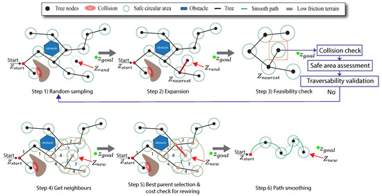 The proposed algorithm is designed in six steps, considering a pair of given harvesting points assigned as start and goal points within the workspace. The steps for the path planning process are depicted in Figure 4, whereas lines of pseudocode are presented in Algorithm 2. In the first step, the proposed algorithm generates a random sample within a bounded region describing an adaptable area that guides the path search. A second step involves extending the path on a tree towards the nearest node that could connect to the next sample node. Before linking the previous nodes, the connection feasibility is checked in step three to ensure that the next node meets the kinematic and slip constraints. Subsequently, a set of neighbor nodes around the potential new node is identified within a radius that changes according to the number of nodes in the tree. Then, the neighbor node (i.e., parent) that minimizes the path distance to each neighbour is selected from this set. After the best node (i.e., the node with minimum cost) is selected, the new node is connected to the best parent and added to the tree, as illustrated in the parent node of step five (see Figure 4). A tree rewiring process is finally carried out with the nearest neighbors that achieve the lowest path cost, and path smoothing is carried out between nodes of the resulting tree.