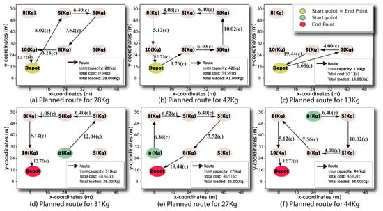 Several trials were carried out to evaluate the TSP-CVRP planner under varying vehicle load capacities and different route waypoints. Assessment criteria included route efficiency, resource utilization, and overall optimization of the harvesting process. Figure 5 presents a set of six route planning trials, showing routes that connect locations prioritized by the weight of the harvested product. These routes ensure that the total weight does not exceed the robot’s payload capacity while minimizing travel costs, which are represented by the distances between interconnected points. In particular, the experiments were performed while initializing different start/end points and several SSMR payload capacities to evaluate the total load harvested by the robot along the traveled route. For instance, in Figure 5a, for an SSMR payload capacity of 28 kg, the planner bypasses two collection points (8 and 10 kg) from the same alley, which could provide the shortest distance if harvesting 8 kg in the second alley. However, in this case the route planner prioritized the highest harvested weight by traveling to additional locations in the field. This prioritization achieved the maximum harvest load of 28 kg compared to the SSMR payload capacity. Furthermore, Figure 5b shows that when increasing the SSMR payload capacity to 42 kg, the planned route enables the robot to visit all harvest points, given a total product quantity of 41 kg (97.6%) distributed in the three alleys. In this case, achieving the maximum payload capacity is prioritized despite visiting all positions. Conversely, Figure 5c illustrates a scenario with a limited vehicle capacity of 13 kg, where the planner visits the nearest points of 8 kg and 5 kg and archives the maximum payload capacity before returning to the product depot. Subsequently, in Figure 5d–f, three additional tests feature several start and end harvest positions that do not match, as well as varying vehicle payload capacities. The results show that the planned route did not necessarily have to start and end at the product depot in order to maximize the harvested product (92.3%, 97.3%, and 91.1%), which is critical if the SSMR would have to restart the harvest process or to supply a harvest point that is not necessarily the final depot. The proposed algorithm is designed to initiate the search either from the depot or from any specified harvesting point. This flexibility allows the algorithm to start from different points, as demonstrated in Figure 5d–f, where the starting points are harvesting points instead of the depot. The algorithm prioritizes the load capacity up to the vehicle’s limit, ensuring that the vehicle does not exceed its maximum payload capacity while still achieving efficient harvesting routes. Moreover, all trials evidence that every single harvesting point in the routes was visited only once, avoiding back-and-forth travels between harvest alleys.