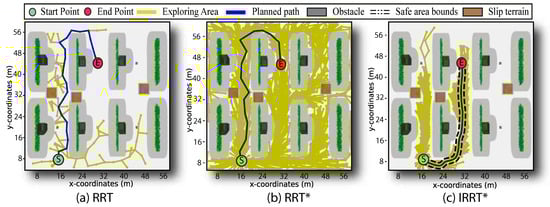 To perform a quantitative performance assessment, we conducted 150 motion control trials using preplanned paths (see Figure 9 and Figure 10). An example of the results is presented in Figure 9 and summarized in Table 3. In all trials, all the three tested approaches consistently avoided structural obstacles in the farm environment; however, only successfully avoided low-traction surfaces with potential slip risks. The obstacle proximity for each approach was consistent, maintaining a safe collision distance; however, the greatest obstacle clearance was achieved with throughout the travel time, demonstrating adaptability to environmental obstacles (see Figure 10a,b). The obstacle avoidance capability of also facilitated suitable maneuverability on challenging terrain, although the total length of the reference path for (64.4 m) was longer than those obtained with (47.4 m) and RRT (41.7 m). Similarly, required a longer time to navigate the path compared to the other methods, which is reasonable, as the proposed approach prioritized fully avoiding obstacles over taking the shortest path, resulting it its fully traveling around the harvesting row. The approach demonstrated longer execution times relative to other tested path planning techniques, which can be attributed to its incorporation of additional information during sampling and its consideration of wheel–terrain interaction in the exploration stage, contributing to more efficient guidance of the robot towards the goal. In addition, produced kinetically compatible paths with good smoothness, 97.63% smoother than RRT and 96.1% smoother than , as shown in Figure 10c.