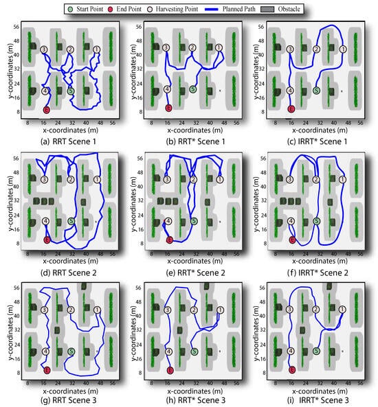 Figure 7 shows the results of the three different test approaches, illustrating the ability of the path planners to avoid structural and randomly located box obstacles in a farm scenario. In this test, the visiting order of the harvest points was taken as a reference to connect different start and end points along the whole harvesting task. It can be observed that while all three methods effectively avoid the structural and box obstacles, the proposed again generates smoother and safer paths than the other two path planners. Furthermore, unlike RRT and , the proposed algorithm avoids returning along counter-directions, preventing kinematically incompatible turns that SSMR robots are unable to perform. Instead, the proposed algorithm maintains the same route or smoothly adjusts the path to continue navigating (see scenarios 2 and 3 for in Figure 7).