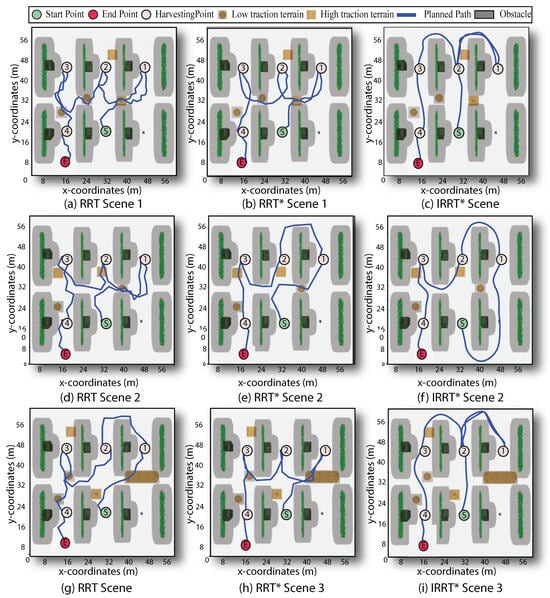 Figure 8 shows the path planning results for each path planner in three different scenarios under conditions with structural obstacles and variable-traction terrain. This test focused on evaluating the ability of the path planners to avoid areas that are prone to slip. Minimum and maximum friction coefficients were used to represent the widest range of slip conditions, indicating areas where a robot may experience low and high traction terrain. The three local path planners were capable of connecting all scheduled points provided by the TSP-CVRP planner, and each waypoint was visited only once. In particular, RRT was not able to present adaptive capabilities to slip conditions in any of the three scenarios. These results show that while the RRT and methods effectively avoided structural obstacles along the planned route, they failed to navigate on low-traction terrain, although slip areas were also considered obstacles in the environment. Moreover, in most scenarios both RRT and provided unfeasible paths for SSMRs that require them to encounter kinematic constraints. On the other hand, the proposed effectively connects the prioritized route points along off-slip travel, generating paths that are kinematically compatible with the robot’s dynamics. The algorithm prioritizes navigating in high-traction regions while generating obstacle-free paths. A particular case can be observed in the results for scenes 1 and 3, shown in Figure 8c–i, where the path had to visit the same harvest point twice. This result is reasonable for the particular scenario, as the prioritized harvesting point was enclosed by a low-traction terrain region and no other feasible solution was available that maintained the shortest local path length.