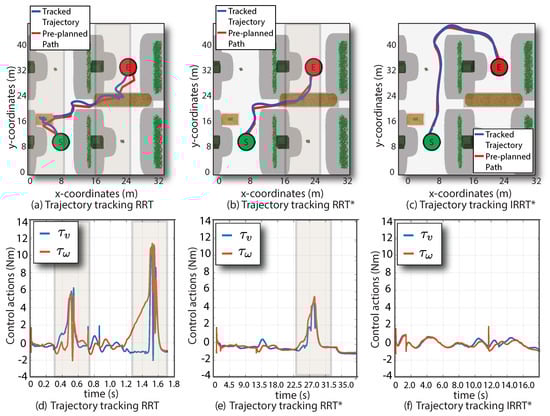 The performance metrics of the motion controllers are presented in Table 4. With , the cumulative path tracking error for the trial, which is related to the ability to avoid obstacles, barely increases over RRT and . However, the control effort of is reduced by about 76.1% compared to RRT and 53.1% compared to , which is attributed to choosing qualified paths with greater smoothness than those selected by the other path planners.