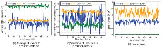 where , with being a given point on the planned path; is the position of the nearest obstacle to the path; and denotes the Euclidean norm. The assessment metrics for obstacle proximity are the average sum of all distance values for each sample point on the path and the distance variability provided by its standard deviation.