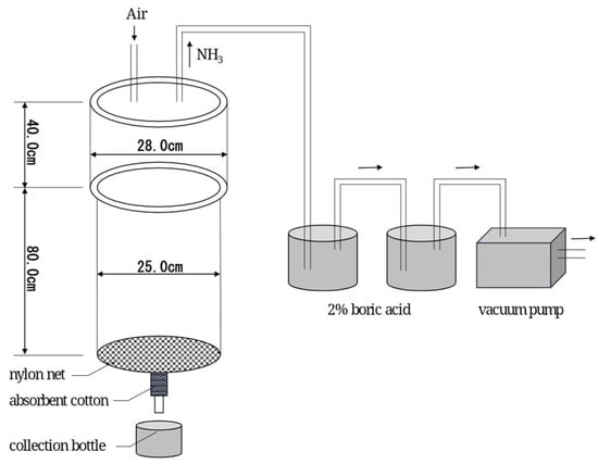 Ammonia emissions were determined using the continuous airflow enclosure method (Figure 1). Ammonia volatilized from the soil within the closed chamber was extracted by a vacuum pump and passed through a gas-washing bottle containing 50 mL of 2% boric acid solution, where it was to be absorbed. Soil ammonia emissions were then quantified by titrating the collected boric acid solution with 0.005 mol·L−1 H2SO4. Measurements were taken on days 1, 2, 3, 4, 5, 7, and 10 following irrigations. Leachate samples were collected on the 1st, 2nd, 5th, and 10th days after irrigation. These samples were analyzed for uniformity in compositions and volume, and concentrations of ammonium N, nitrate N, and total N content were analyzed via a flow injection analyzer (FIA-6000+, Beijing Jitian Instrument Co., Ltd., Beijing, China).