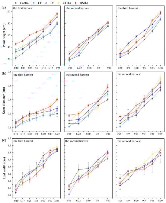 Alfalfa stem diameter increased across the harvests (Figure 2b). After the three harvests, the stem diameter in the DS treatment increased by an average of 2.83% relative to CF, and DSHA increased by 12.50% relative to DS; however, neither were statistically significant. The CFHA treatment resulted in a significant increase of 40.23% in the first harvest and a significant increase of 17.04% in the second harvest compared to CF, while the third harvest showed a 7.01% increase, which was not significant. Figure 2c illustrates the response of leaf width under different treatments under the same N application rate. Both CF and DS treatments increased leaf width, under the same N application rate, yet showed no significant difference between them. The addition of humic acids did not produce consistent changes compared to the treatment without humic acids.