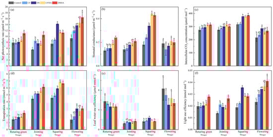Leaf water use efficiency, WUE, during the returning green and flowering stages was relatively high, ranging from 4.65 to 8.33 μmol·mmol−1, with no significant differences observed among treatments (Figure 3e). The WUE during the jointing and squaring stages was lower, ranging from 1.25 to 2.40 μmol·mmol−1. Light use efficiency, LUE, did not show significant differences among CF, DS, and CFHA, except during the squaring stage (Figure 3f). The DSHA treatment was significantly greater than the other treatments. During the squaring stage, DS had the highest LUE, reaching 0.0356 mmol·mol−1.