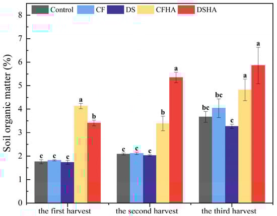 Effect of the treatments on soil organic matter measured directly after each harvest in the top layer (0–20 cm). Different lowercase letters indicate significant (p < 0.05) differences between treatments. Error bars indicate standard deviations (n = 4).