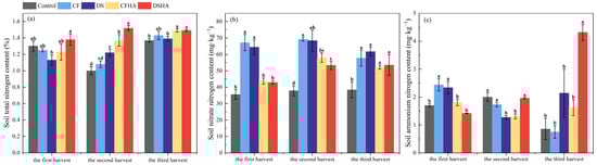 Nitrogen content in different forms within the 0–20 cm soil layer. (a) The total nitrogen content in soil; (b) the nitrate nitrogen content in soil; (c) the ammonium nitrogen content in soil. Different lowercase letters indicate significant (p < 0.05) differences between treatments. Error bars indicate standard deviations (n = 4).