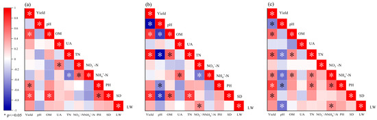 The relationships between alfalfa yield and soil physicochemical properties. * Represents a significant relationship between two indicators (p < 0.05). (a) The relationships in the first harvest; (b) the relationships in the second harvest; (c) the relationships in the third harvest. In this figure, OM means soil organic matter, UA means soil urease activity, TN means soil total nitrogen, PH means the plant height of alfalfa, SD means the stem diameter, and LW means the leaf width.
