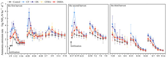 The ammonia emission rates for each treatment after fertilization and irrigation are shown in Figure 7. Compared to the Control treatment, fertilization significantly increased the ammonia emissions rate. During the first two harvest periods, the peak of the ammonia emission rate occurred between the second and fourth day after irrigation. The treatments with only fertilizers (CF and DS) reached the peak on the same day as the Control treatment, while the treatments with additional humic acids (CFHA and DSHA) reached the peak one day later and the peak was lower. During the third harvest, the peak of each treatment was observed on the day immediately following irrigation. During all the three harvests, the trend of ammonia volatilization rate was to increase initially, reach a peak, and then decrease until it became stable.