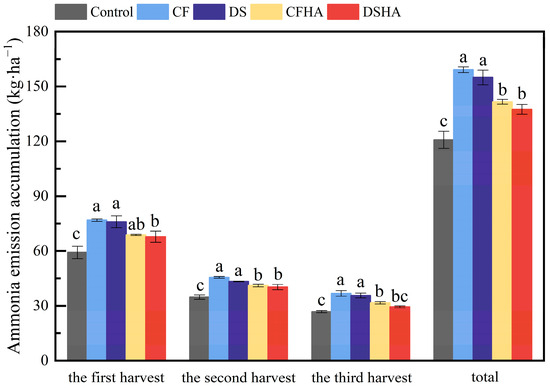 The accumulation of ammonia emission. Different lowercase letters indicate significant (p < 0.05) differences between treatments. Error bars indicate standard deviations (n = 4).