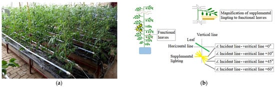 Cultivation arrangement of different incident light abaxial supplemental lighting treatments. (a) Cultivation situation in the greenhouse. (b) Arrangement of different abaxial supplemental lighting.