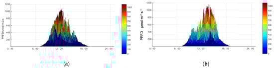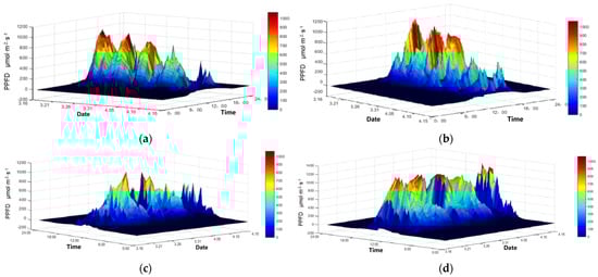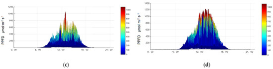 Daily variation in the irradiation conditions of the tomato inter-canopy with the angle between the incident light and the vertical line at 0° (a), 30° (b), 45° (c), and 60° (d).