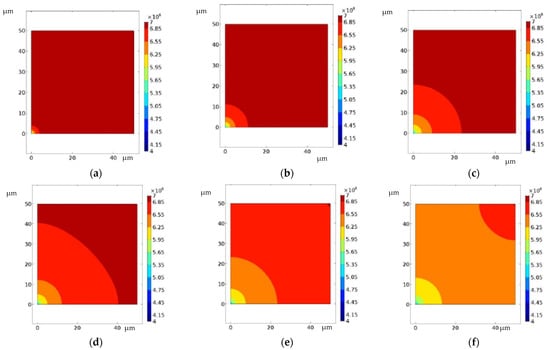 Based on the software calculation, the gas pressure changes in the calculation unit inside the leaf starting from CO2 entering the stomata are shown in Figure 6. The results showed that as the intake time continued, the area where the gas pressure inside the leaves changed gradually expanded. Under the action of air pressure and solute hydraulic pressure, the gas gradually diffused and penetrated from the stomata to the veins and upper epidermis of the leaves. The pressure gradient continuously transmitted to the depths of the leaves, and the pressure range affected by the intake increased.
