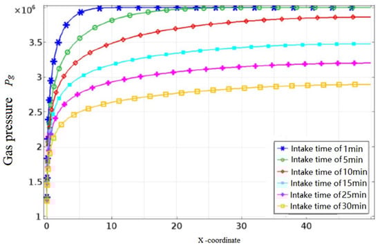 By analyzing the pressure distribution along the y = 0 m straight line at different times, the pressure diffusion situation on a single dimension was obtained, as shown in Figure 7. At the stomata, the pressure is the same as the atmospheric pressure, with the lowest being 1.01 MPa. In the early stage of intake, because of the large pressure gradient between the blade cells, the gas flow rate is high. At this time, the intake speed is fast, and the air volume near the intake port is high. As the intake time increases, the pressure difference inside the blade gradually decreases, and the rate remains flat.