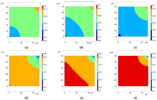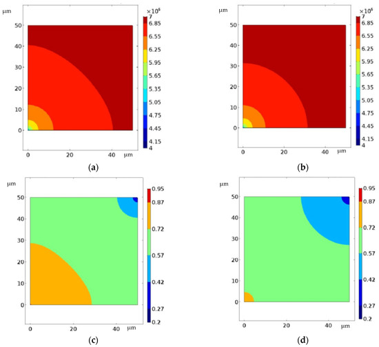 The main parameters of the calculation area are shown in Table 1. The simulation range was selected as 100 μm × 100 μm, as shown in Figure 2. The center of the blade was set as the stomata, and the number of stomata in each simulation range was set to 1. The air pressure at the stomata inlet was 1.01 MPa, with coordinates (0, 0). The design model had symmetry, and 1/4 of the model was used for research. The fluid–solid coupling dual-medium model was solved as shown before with software.