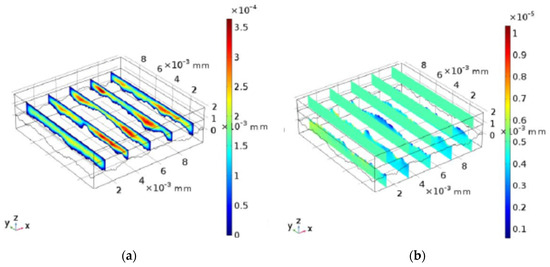 The simulation comparison results of gas flow velocity inside the leaf under the coupling and non-coupling of light quantity and light direction are shown in Figure 10. In Figure 10a, the fluid under coupling conditions has a gentle velocity at wider channels and a higher velocity at narrower channels, with a maximum velocity of 0.15 mm·s−1. Under non-coupled conditions, i.e., away from the light source, as shown in Figure 10b, because of the decrease in the calculated permeability, the maximum fluid velocity is only 0.01 mm·s−1.