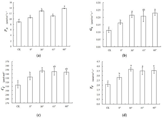 According to the simulation results in the previous section, the coupling of light quantity and light direction accelerates the overall flow rate of CO2 inside the leaves, which is conducive to its diffusion and entry into the mesophyll cells to participate in photosynthetic reactions as soon as possible. Therefore, in terms of photosynthesis, this should promote an improvement in leaf photosynthesis. This result has been confirmed in cultivation practice. As shown in Figure 12a, tomato Pn significantly increased under supplementary light treatment compared with the blank control CK. Among them, Pn was the highest under the 60° incident light treatment, which was 36.8% higher than that of CK. Under the 30° treatment, Pn took second place, increasing by 33.7% compared with CK. The Pn values under the 45° and 0° treatments were close, increasing by 10.5% compared with CK. The variation trends in Gs, Ci, and Tr were similar, but slightly different from the variation trend in Pn. There was no significant difference in the parameter values under the 30°, 45°, or 60° treatments, and they were all significantly higher than those under the 0° and CK treatments, while the CK treatment reaches the lowest, as shown in Figure 12b–d.