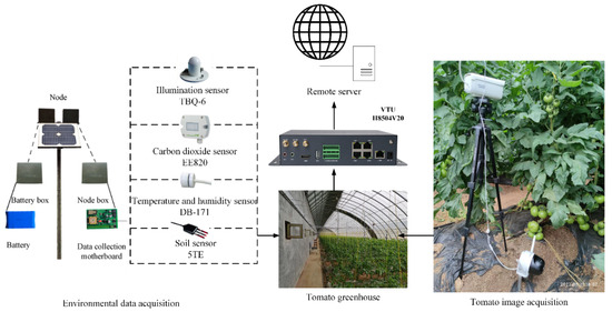 The IoT environment data acquisition system is mainly composed of the CPU, perception module, and transmission module. The core of coordinating the work of each module and ensuring the stable operation of the system is the CPU, which can realize the functions of data storage, data analysis, and data interaction. The sensing module realizes the accurate perception of air temperature, humidity, and light intensity through external sensing equipment. The transmission module uploads the collected information to the server in real time through the IoT transmission device. Parameters of the IoT sensors are shown in Table 4. A 5G network Dahuale orange TS2F camera is selected for image data acquisition, with a resolution of 4 million HD, rotating with head, including levelness and verticality, supporting full-color night vision. The camera is installed at a height consistent with the tomato fruit, maintaining a horizontal distance of about 50 cm. The captured images have a resolution of 1920 × 1080 pixels, and all camera parameters are set to the default mode. The data acquisition system architecture is shown in Figure 1.
