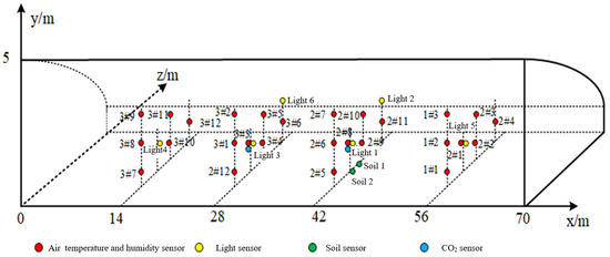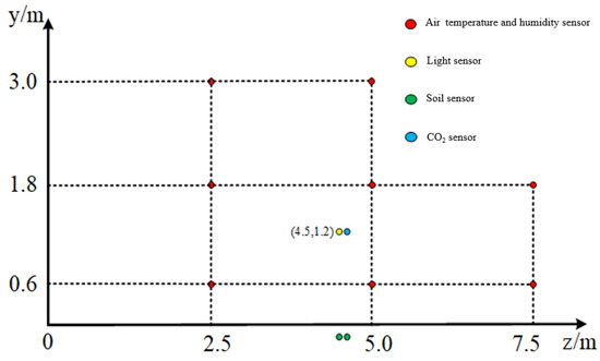 To reduce the measurement error of the sensors and ensure the effective monitoring of the greenhouse environment, multiple groups of sensors are uniformly distributed in the greenhouse. In the height direction, the sensors are arranged in the 0.6 m, 1.8 m, and 3.0 m planes. In the north–south direction, the greenhouse is divided into four parts with 2.5 m as a unit, and sensors are arranged at 2.5 m, 5 m, and 7.5 m. In the east–west direction, the greenhouse is divided into five parts in units of 14 m, and sensors are placed at 14 m, 28 m, 42 m, and 56 m. The stereo diagram and side view of the sensor deployment point are shown in Figure 2 and Figure 3, respectively.