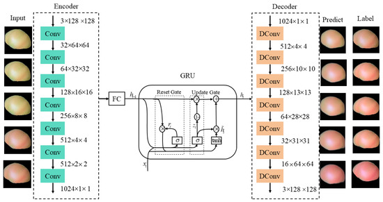 With the passage of time, tomato color will change dynamically in the space dimension. Compared with traditional data, tomato color is dependent on the time dimension and space dimension, so it is necessary to consider the influence of different positions in space. Therefore, the tomato growth data set belongs to the spatial–temporal series data [24]. To take into account both the time and space dimensions, Zaremba et al. proposed the RNN structure, which can deal with the problem of spatial–temporal series prediction. A schematic representation of a typical structure of an RNN encoder–decoder is shown in Figure 5. However, the RNN is prone to the problems of gradient disappearance and gradient explosion, so it only has short-term memory [25]. The introduction of the long short-term memory network (LSTM) solves the problem of the RNN, but the internal structure of the LSTM is complex, and the training efficiency is low. The emergence of the gated recurrent unit network (GRU) solves the above problems. In this paper, the dependent variable is set as tomato color while the independent variable is air temperature. To fully utilize spatial–temporal information, historical data of tomatoes are analyzed to predict future growth states through multi-step spatial–temporal prediction. Additionally, a two-dimensional image representation of the tomato growth data set is studied to reflect its growth state in an intuitive manner.