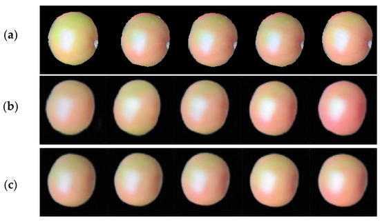 Tomato growth prediction results of LSTM and GRU models with encoder–decoder structure. (a) Real tomato images, (b) LSTM tomato growth prediction results, and (c) GRU tomato growth prediction results.