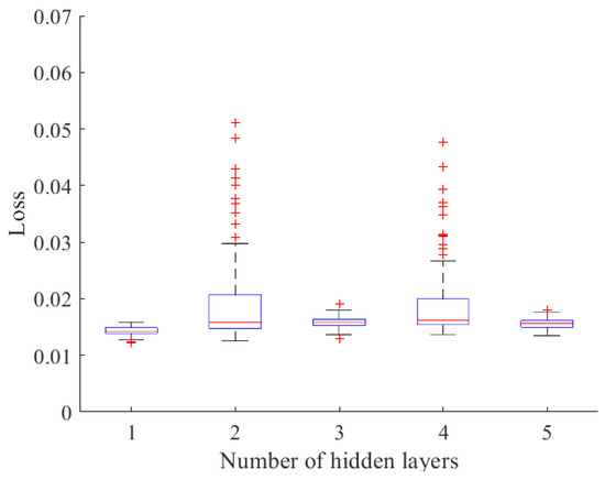 The number of hidden layers has a great impact on model performance. Therefore, the hidden layers of the network are set as 1–6 in this study. As shown in Table 6, the models with odd numbers of hidden layers are better than the models with even number of hidden layers in predicting tomato growth color. As the number of network layers increases, the model training will be more difficult, the overfitting will be more serious, and the effect of shape and color prediction will become worse. In this study, the model with the least number of layers but the performance second only to the optimal performance is chosen as hidden layer number 1. Figure 9 shows the change curve of loss value in the last 100 rounds of training. When the number of hidden layers is 1, there are two specific points, both of which are low specific points, indicating that the loss value is lower than other loss values, the loss value is small, and the fluctuation range is small.