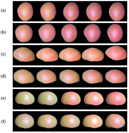 Prediction results of tomato colors at different stages (environment): (a) real tomato images at five panicles, (b) prediction results for tomatoes at five panicles; (c) real tomato images at three panicles; (d) prediction results for tomatoes at three panicles, (e) real tomato images at the first panicle, and (f) prediction results for tomatoes at the first panicle.