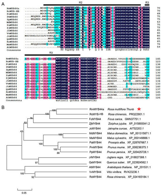 Multiple sequence alignment and evolutionary tree. of MYB44 (A) Multiple sequence alignment of RmMYB44 and its homologous genes from 14 other plants. (B) Evolutionary tree analysis of RmMYB44 and homologous sequences was performed by the maximum likelihood method to construct a phylogenetic tree using MEGA 11.0 software, and the bootstrap parameter was set to 1000 to ensure the robustness of the tree. The red star represented MYB44 in R. multiflora.