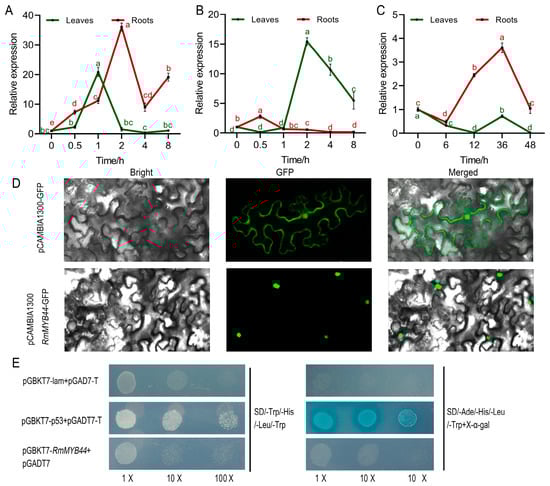 Expression patterns of RmMYB44 in R. multiflora. (A) Relative expression of RmMYB44 in roots and leaves treated with low temperature for 0, 0.5, 1, 2, 4, and 8 h. (B) Relative expression of RmMYB44 in roots and leaves treated with salt for 0, 0.5, 1, 2, 4, and 8 h. (C) Relative expression of RmMYB44 in roots and leaves treated with drought for 0, 6, 12, 36, and 48 h. (D) RmMYB44 was localized to the nucleus, with left, center, and right panels representing bright field, dark field, and merged field, respectively. (E) Assessment of self-activation of RmMYB44. The different letters denoted the significant differences at a significance level of p < 0.05.